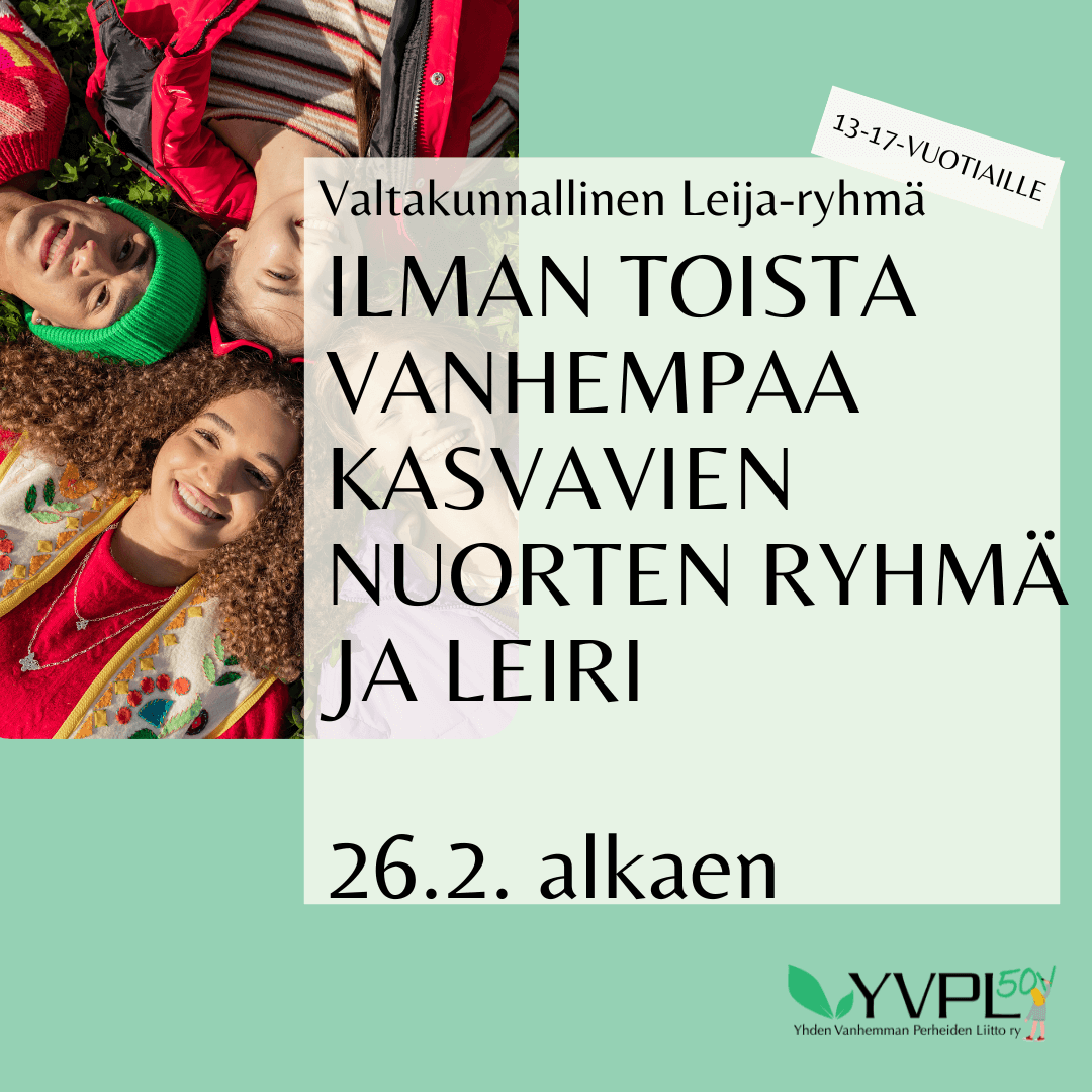💚 Tämä vertaisryhmä on tarkoitettu ilman toista vanhempaa kasvaville nuorille*. Nuori voi kasvaa ilman toista vanhempaa esimerkiksi vanhempien eron vuoksi, tai koska vanhemmat eivät ole missään vaiheessa olleet parisuhteessa. Toinen vanhempi on myös aiemmin saattanut olla mukana elämässä, mutta yhteys on katkennut.