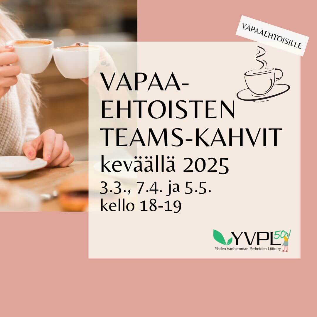 Järjestämme vapaaehtoisille vapaamuotoisia iltoja Teamsissa, jossa voi rupatella vapaaehtoisuudesta, kuulumisia ja vaikkapa yhdistyksen toiminnasta. Kahveja vetää liiton vapaaehtoinen. Kahvit keväällä 2025: 3.3., 7.4. ja 5.5. kello 18-19. Lisätietoja ja linkki anneelisabet.belt@yvpl.fi